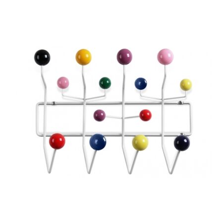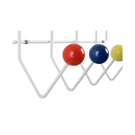 Replica dell’appendiabiti del 1956 di Charles e Ray Eames. Le sue sfere dai colori vivaci, provocano i bambini ad agganciarci “tutte le cose”, così come indica il nome dell’oggetto “Hang it all”. Realizzato in filo di acciaio verniciato bianco le sfere sono in plastica di vari colori. Dimensioni, larghezza 47 cm, profondità 12 cm, altezza 35 cm.