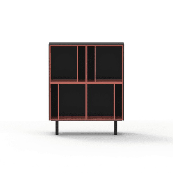 Credenza con quattro vani a giorno, finiture in melaminico e scocca sp. 18 mm. Top e fianchi di chiusura di sp. 12 mm. La struttura è sostenuta da piedini 40 x 40 x h.195 mm. quadrati in abs. Dimensioni : L. 102 x P. 46 x H. 125 cm.