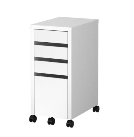 Cassettiera con tre cassetti, schedario e ferma cassetti che impediscono l’estrazione completa dei cassetti.