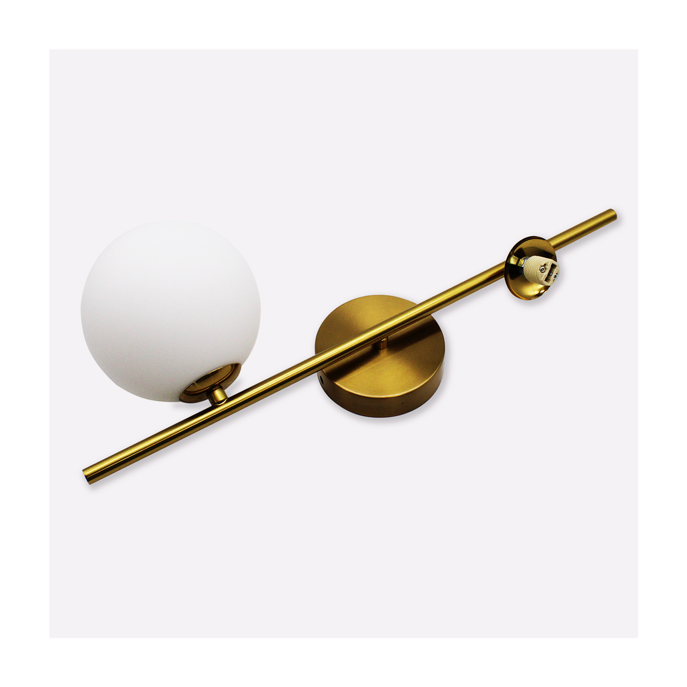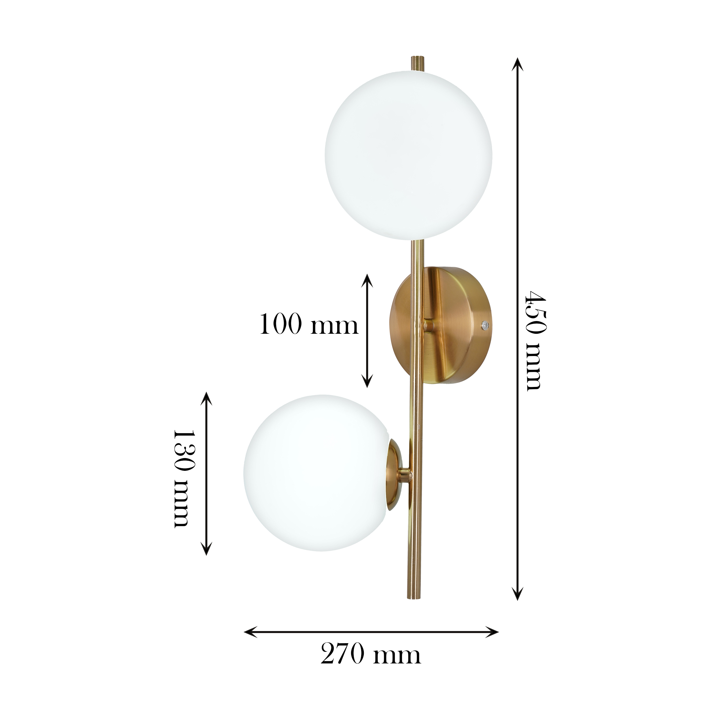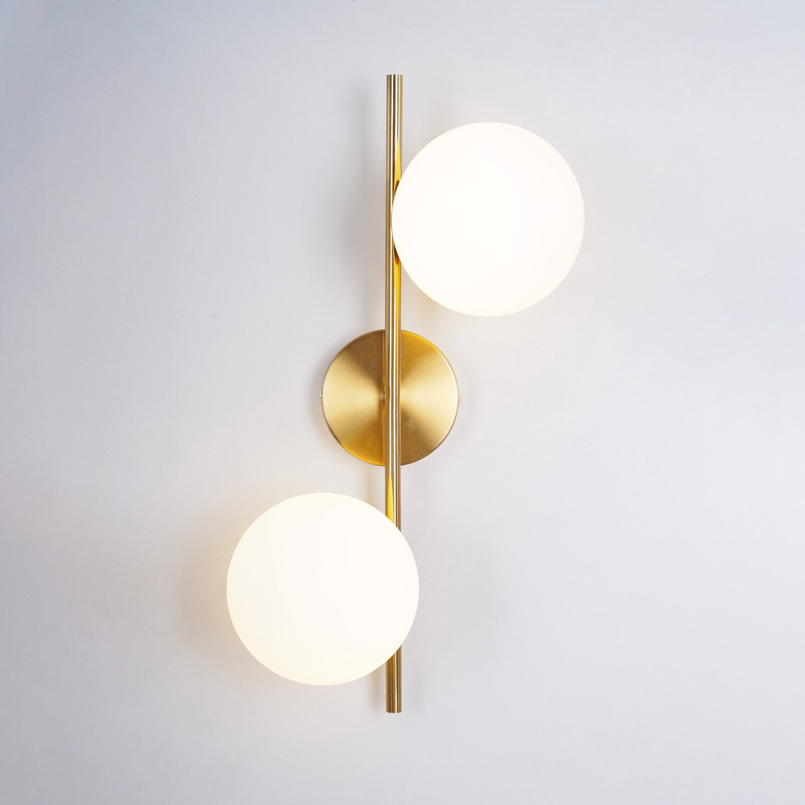 Apparecchio di illuminazione da parete a due diffusori. Telaio in ottone, spazzolato e verniciato trasparente, diffusori in vetro opalino. Diametro diffusori 13 cm, lunghezza braccio 45 cm