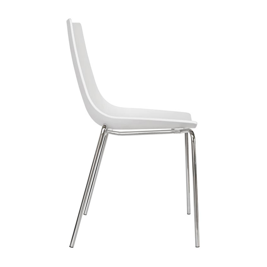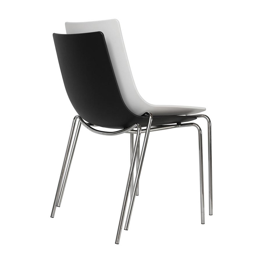 Sedia ” impilabile ” con struttura in metallo cromato, scocca in polipropilene nei colori bianco, nero, rosso, grigio.