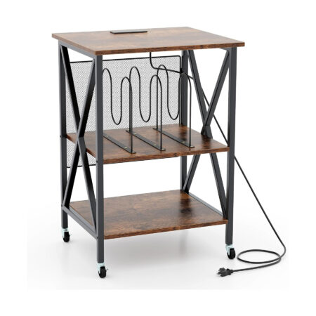 Tavolino a tre ripiani per giradischi dotato di tre porta vinili a forma di M per contenere i dischi in modo ordinato. Costituito da piani in legno e telaio in metallo è dotato di quattro ruote tra cui due bloccabili. Dotato di alimentazione elettrica e prese USB. Rifinitura dei piani in melaminico colore legno e struttura in metallo colore nero. Dimensioni cm75 alt. x cm52 lungh. x cm45 prof.