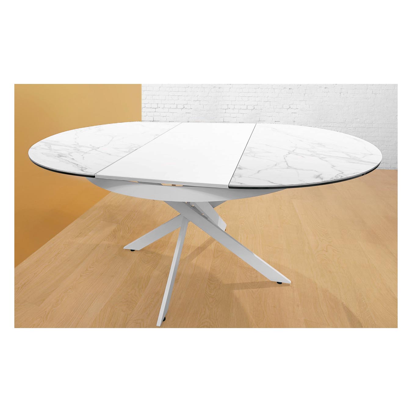 Tavolo rotondo 4 posti allungabile con struttura in metallo verniciato, piano allungabile in vetroceramica spessore 11 mm. estensione in mdf laccata.